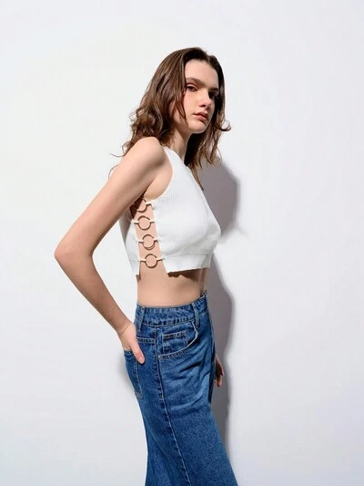 SHEIN Maija Novo Estilo de Primavera e Verão Top de Tricô Feminina Branca com Anel de Metal Decorativo na Cintura, Elegante e Moderna para Uso Urbano, Casual e Diário, Adequada para Sair, Férias, Festas, Casamentos e Encontros