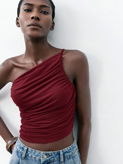 SHEIN Maija Nova Top Feminina Assimétrica com Ombro Assimétrico, Tecido de Tule Franzido na Cor Vinho Tinto, Ideal para Primavera/Verão, Festas de Dia de São Patrício, Páscoa, Praia, Férias de Verão, Formatura e Eventos-35%