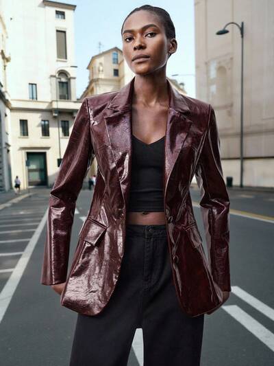 SHEIN Maija Jaqueta de PU Marrom Café de Ombro Caído com Colarinho Alto e Pala Assimétrica Solta, Adequada para a Temporada Moderna Urbana do Início do Outono de Volta às Aulas, Outono, Inverno e Ano Novo, Jaqueta Marrom, Clássica e Usável, Estilo Old-Money, Discreto e Chique-25%