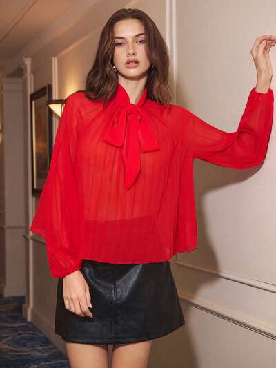 SHEIN Maija Blusa de Manga Longa com Gola de Laço Elegante e Cor Sólida para Mulheres